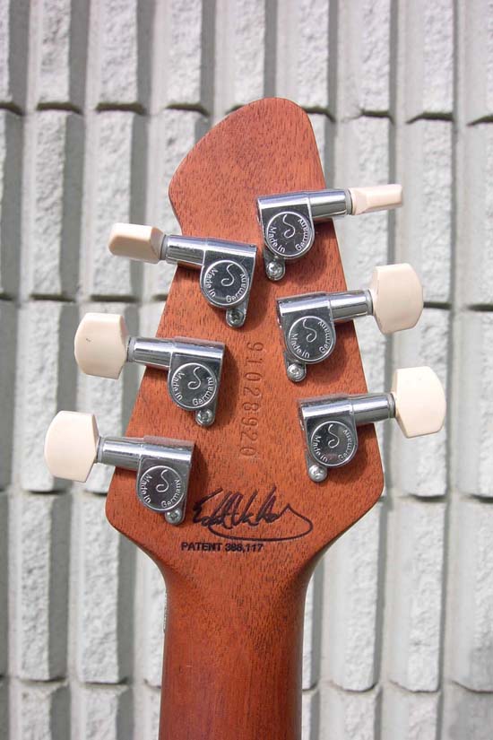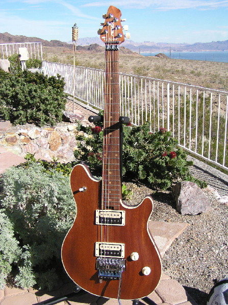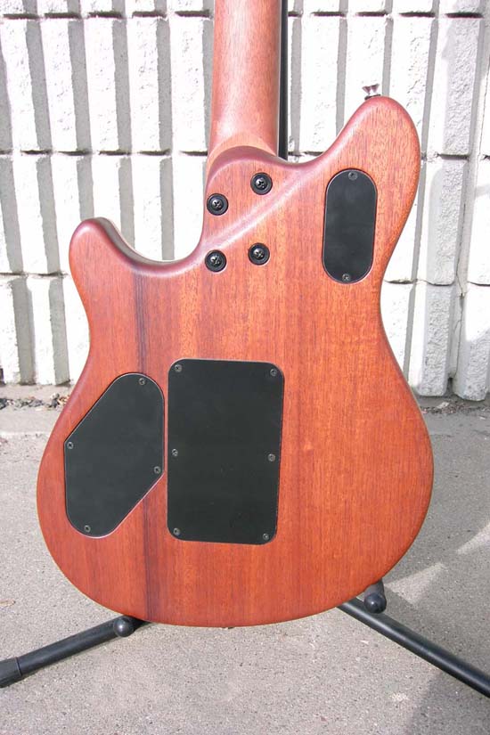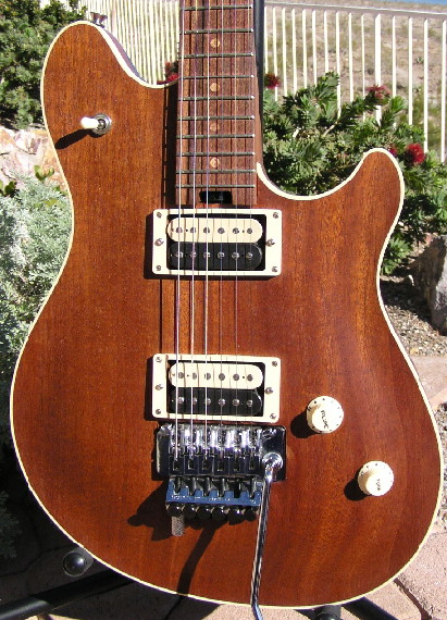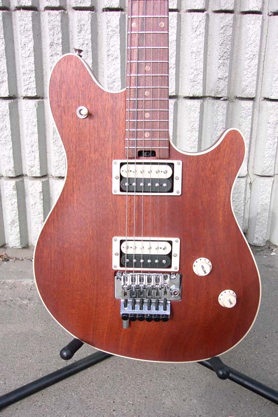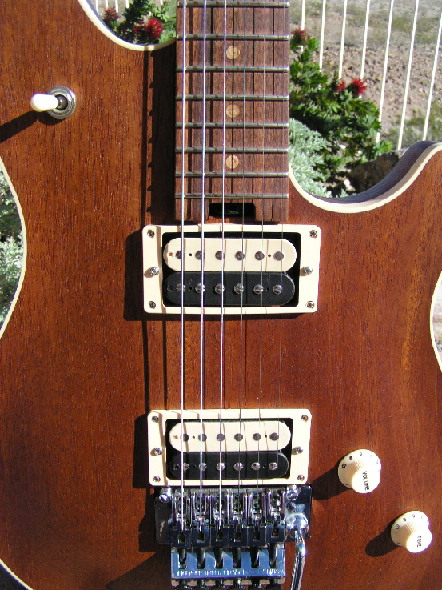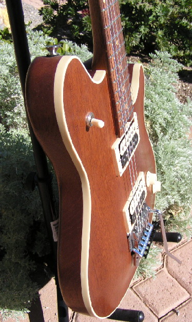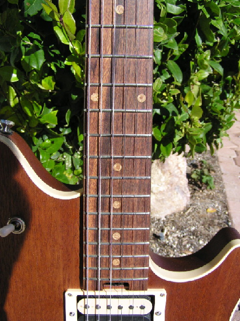 This guitar is really all mahogany, a custom deluxe model with rosewood fretboard and maple dot inlays, with a hand rubbed oil finish. The creme colored pick-up rings and knobs finish off a real vintage look. It was built in Leakesville but not delivered until after the move in October of 2003.