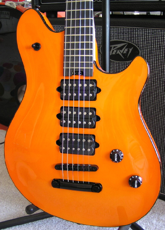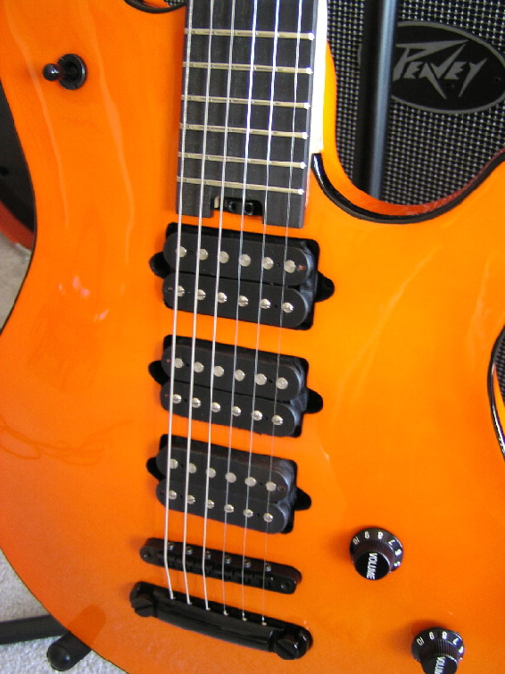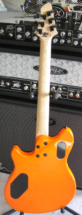 This is the only guitar done in Safety Orange and the very last Custom Shop guitar produced. In fact, it was sold unfinished and had to go back because they didn't have time when it was all ending. They made a few others like this in black. It is an ash body, with volume controls on the neck and bridge pick-ups and it has coil tap switch when one pulls out the 2nd volume knob. One can get some unique tones out of this one. It has an ebony fretboard with just side markers, and Orange body and a matching headstock.