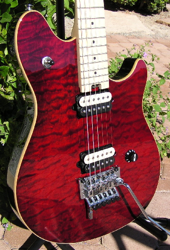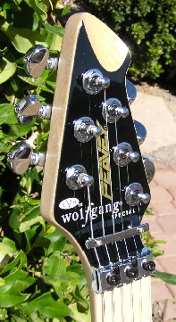 The bridge is, like in all other models, a Floyd Rose licensed double locking trem, with a patented D-tuner. The body is solid basswood but the top in simply a thin maple cover. The Wolfgang Special EXP has a bound flat top.