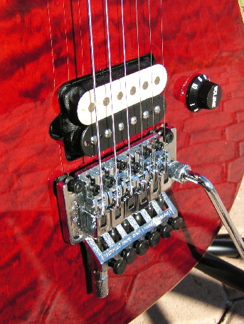 - Bridge: Floyd Rose with d-tuna installed on lower E-string; this tremolo unit is recessed (lowers pitch only).