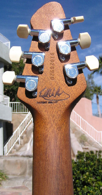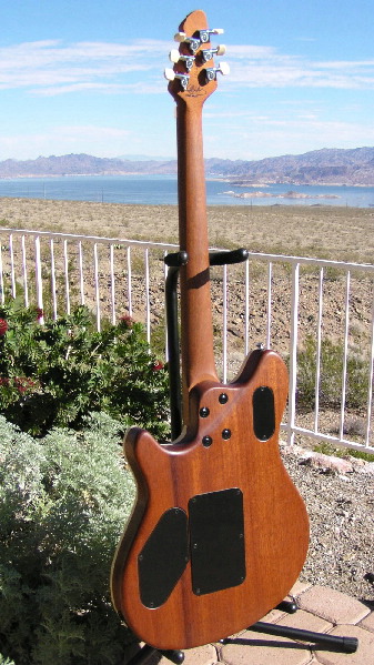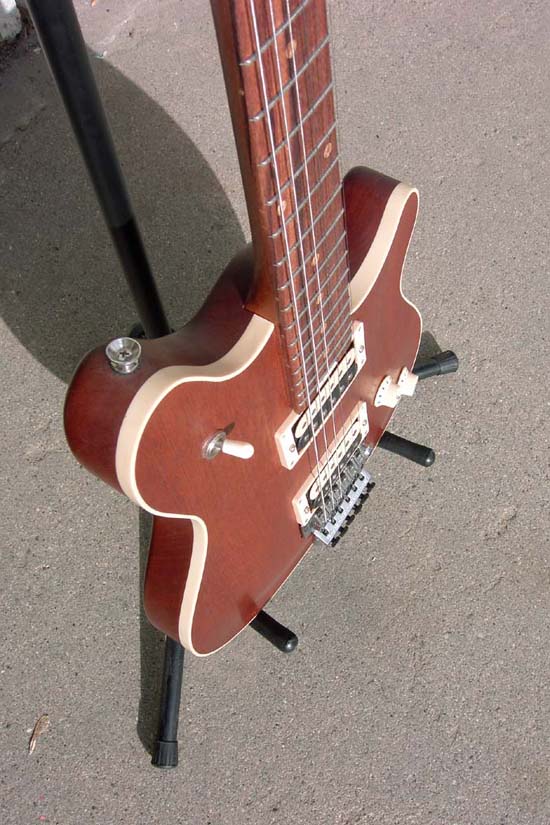 This guitar is really all mahogany, a custom deluxe model with rosewood fretboard and maple dot inlays, with a hand rubbed oil finish. The creme colored pick-up rings and knobs finish off a real vintage look. It was built in Leakesville but not delivered until after the move in October of 2003.