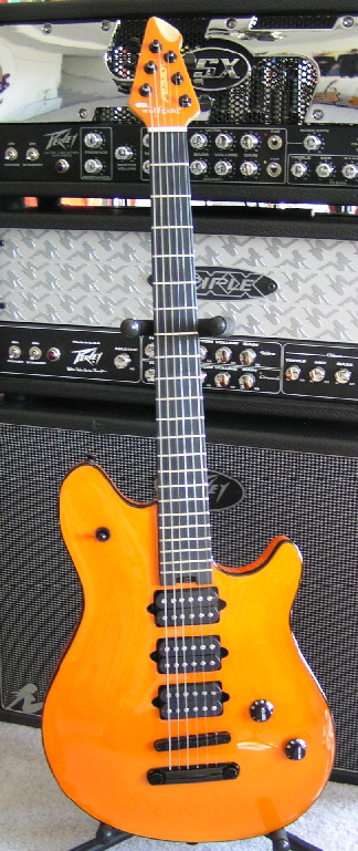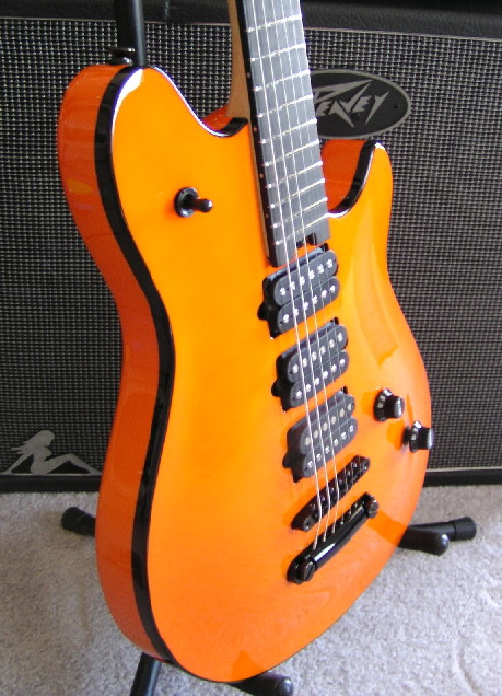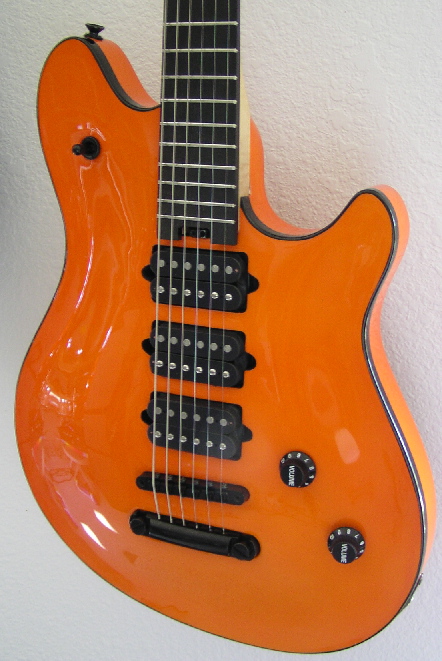 This is the only guitar done in Safety Orange and the very last Custom Shop guitar produced. In fact, it was sold unfinished and had to go back because they didn't have time when it was all ending. They made a few others like this in black. It is an ash body, with volume controls on the neck and bridge pick-ups and it has coil tap switch when one pulls out the 2nd volume knob. One can get some unique tones out of this one. It has an ebony fretboard with just side markers, and Orange body and a matching headstock.