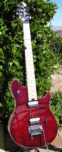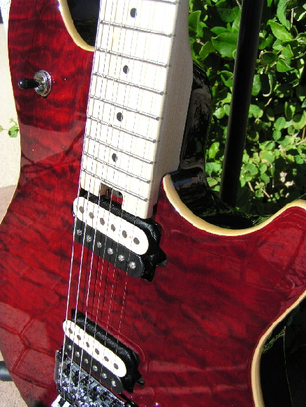 The bridge is, like in all other models, a Floyd Rose licensed double locking trem, with a patented D-tuner. The body is solid basswood but the top in simply a thin maple cover. The Wolfgang Special EXP has a bound flat top.
